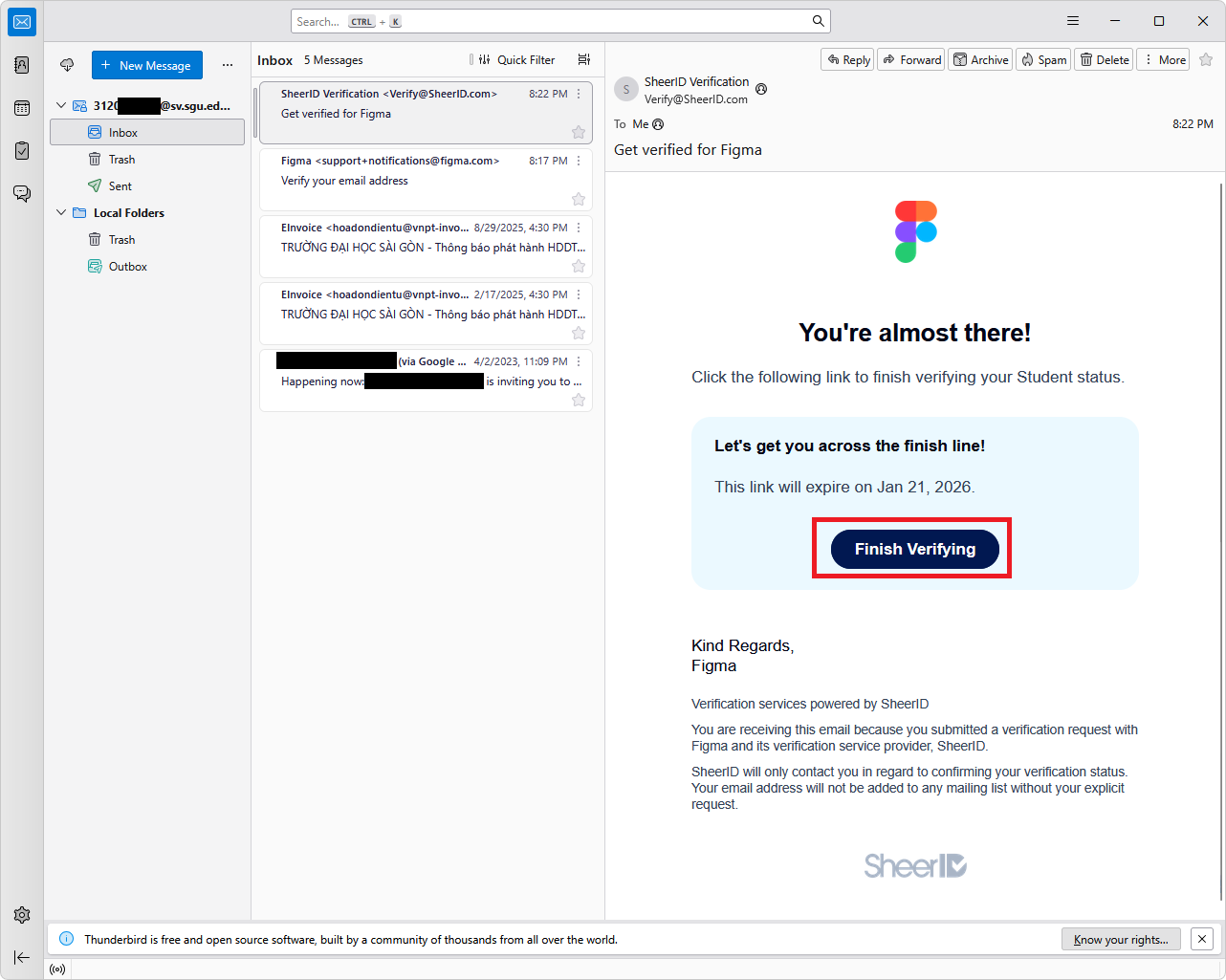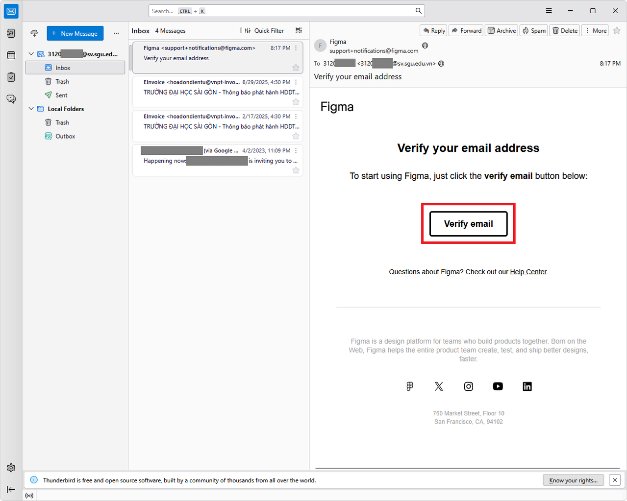 - Kiểm tra email *@sgu.edu.vn*. Mình dùng **Thunderbird** nên hiện thông báo dưới góc.