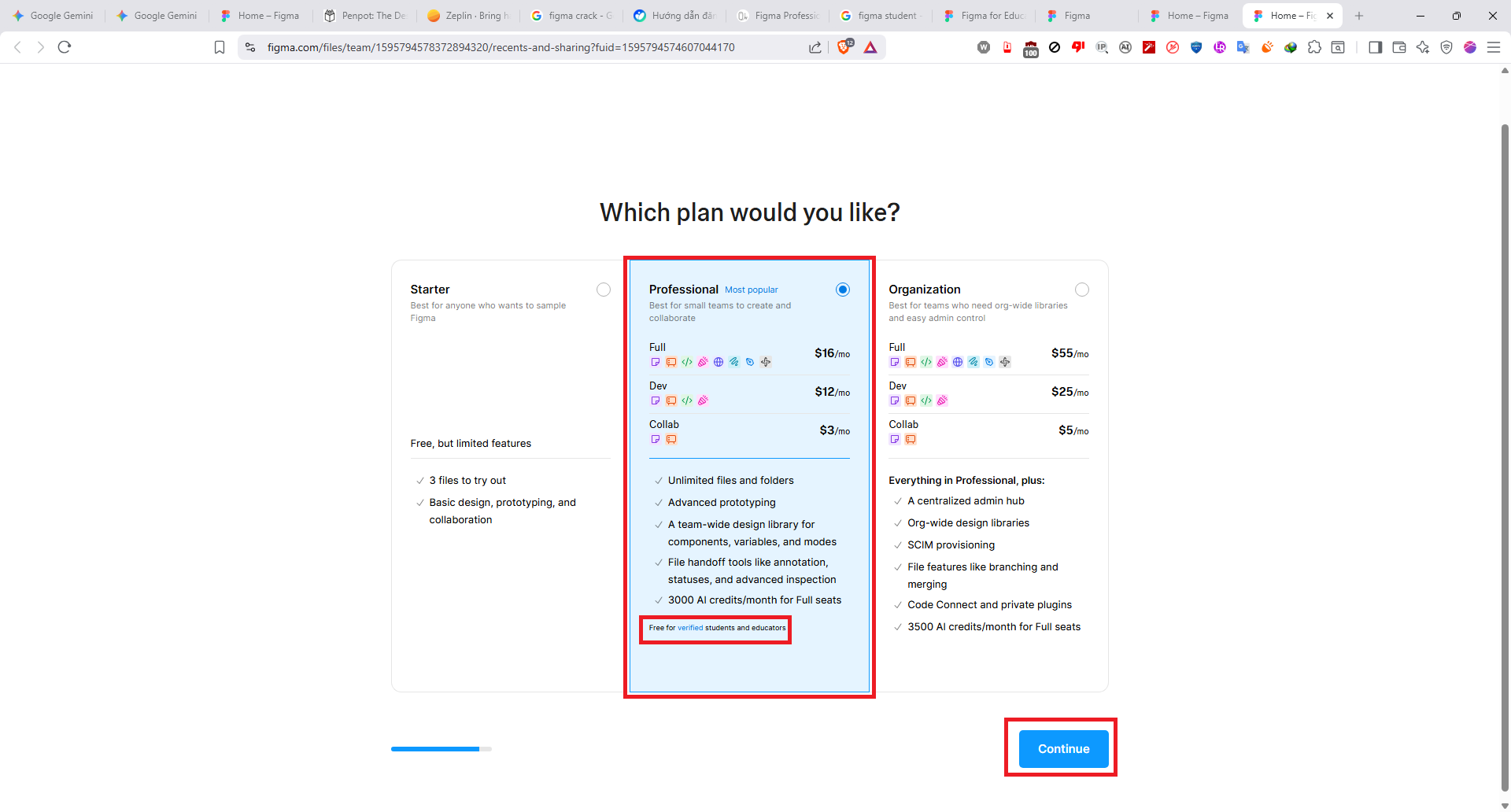 - Chọn Professional plan & nhấn Continue.