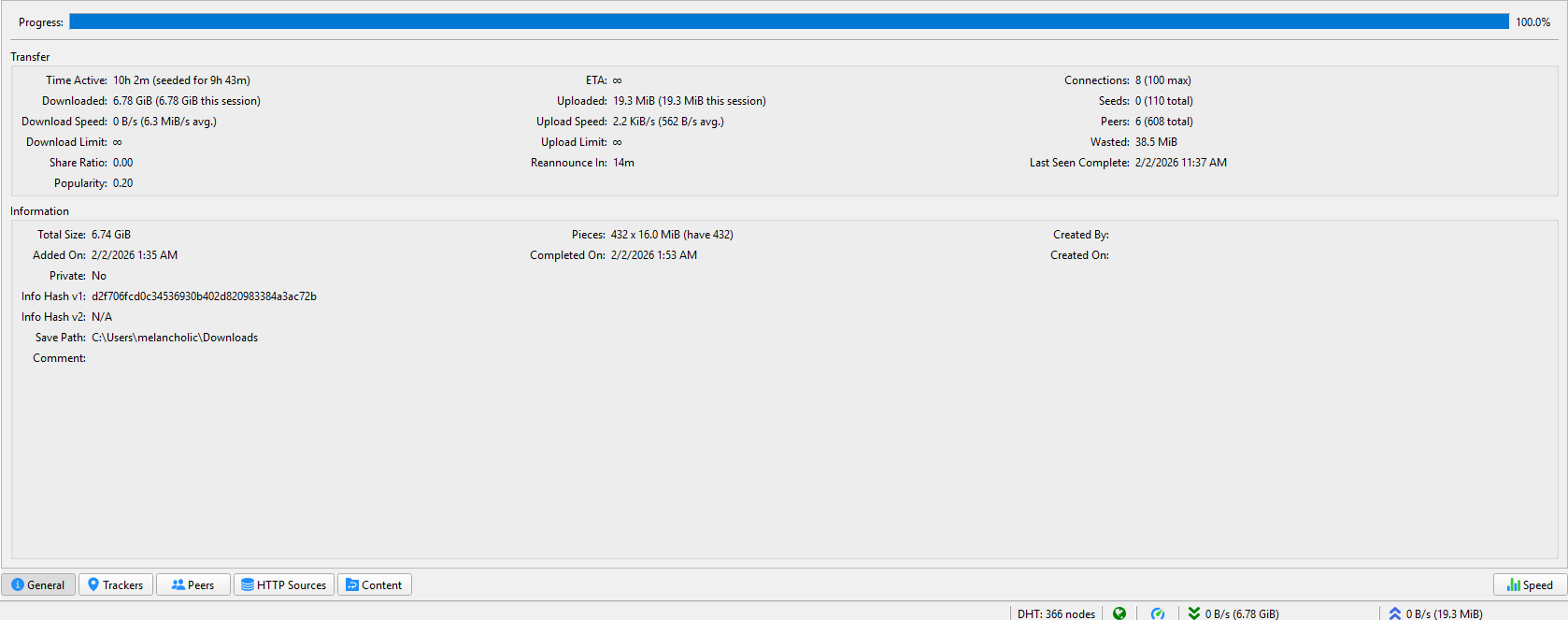 Pieces: Torrent files are split into tiny Lego blocks called “pieces.” This file is made of 432 pieces, and each piece is 16 Mb in size. You have all 432 of them.